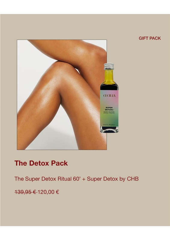 The Detox Pack unisce il Super Detox Ritual da 60 minuti, un trattamento intensivo mirato a drenare, ridurre il gonfiore e attivare la circolazione, al Super Detox by CHB, il concentrato naturale che supporta fegato, sistema linfatico e processi depurativi.