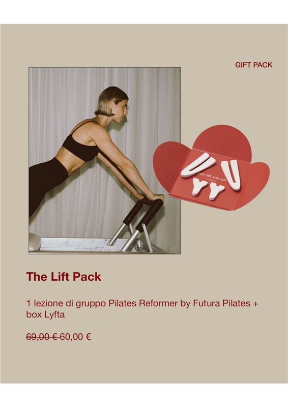 Include 1 lezione di gruppo Pilates Reformer by Futura Pilates, per lavorare su postura, tono e allungamento muscolare, e una box Lyfta, il set di lifting tape per il viso pensato per ridefinire i lineamenti, distendere la muscolatura facciale e rendere le tue rughe visibilmente più distese e meno marcate.
