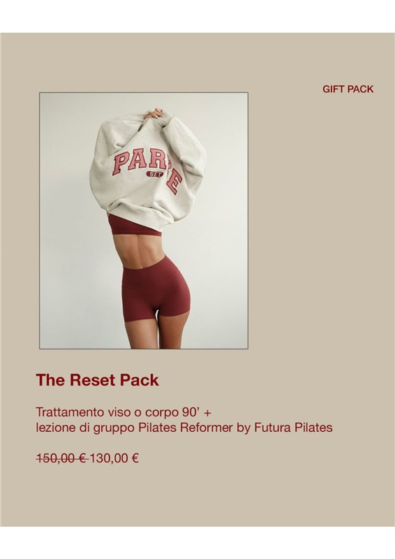 The Reset Pack combina un trattamento viso o corpo da 90 minuti – pensato per drenare, scolpire e riequilibrare – con una lezione di gruppo di Pilates Reformer firmata Futura Pilates, per potenziare postura, tono muscolare e consapevolezza del corpo.